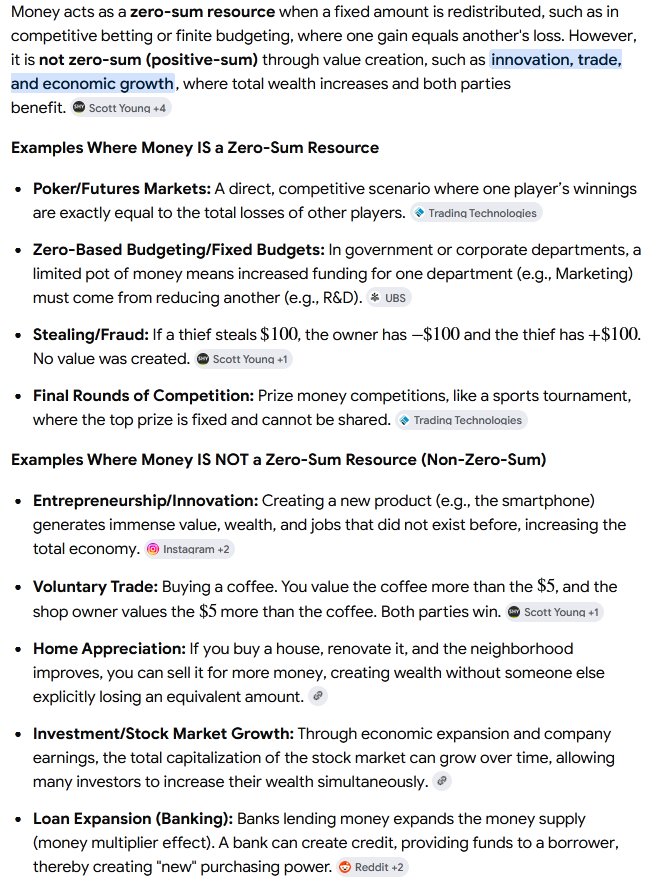 >>948472246>>Money isn't a zero-sum resource>Money is a classic example of a zero-sum resource.You both completely contradict each other and you're both right and both wrong. You have to make more than a tweet-length sentence to distinguish whether money is or is not a zero sum resource.See image.