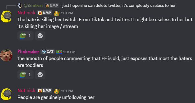 So Katchii started scrolling through her private IG ( https://www.instagram.com/weenterwonderland/ ) and DMing her male friend about how she's perceived. Suddenly, she cares about her image? Is she planning to come back? Did she really stop respecting Nick's opinion, eh?BTW, when Nick suggested Katchii stream with Arthur, instead of replying that she preferred him, she simply replied that she was more afraid of schizo comments.Soon.