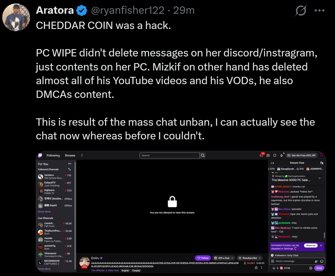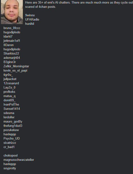 >>948541796hes just a troll and probably from paracordthey love to say it was a mizkid server but this video was made directly by them back in 2024 https://www.reddit.com/r/LivestreamFail/comments/1og5vv3/mizkif_rages_over_emirus_rust_stream_viewership/