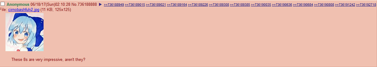 So I thought I'd just make a thread for all the things I know about Cirno's origin and interesting coincidences.- In 1958, Sergio Cirno Bissi painted "Female portrait in 18th-century costume". The girl in the portrait had light blue hair: https://www.catawiki.com/en/l/100799957- In 1978, YMO released the song "Yellow Magic". The song in the following video sounds very similar to Cirno's theme at 29 seconds: https://www.youtube.com/watch?v=K3DSwl3gMTc&t=39s- In 1982, Kunihiko Mitamura released the song "Omoide No Itoguruma". The part that sounds like Cirno's song starts at 23 seconds: https://www.youtube.com/watch?v=Re0K9dqGt9Y&t=23s- In 1989, Orup released the song "Min mor sa till mej". In it, it talks about a "blue-eyed idiot". The song also contains a portion that sounds like Cirno's theme at 2:27: https://www.youtube.com/watch?v=QfH5usYFxSo&t=2m27s- In a 1996 Gamest interview, artwork was shown of Marisu and Teresu. The pattern of Marisu's dress might have inspired Cirno's dress.- In 1998, ZUN introduced a blue-haired girl named Mai, a character in Touhou: Mystic Square for the PC-98. She is found in the frozen fields within Makai. Her theme song and icy theme could be a reference to the ninth circle of Hell in the Divine Comedy (circle 9).- Volume 4 of Sarai was released in 2001 and introduced the character "チルノ" (name only). Volume 6 came out shortly later in 2001 and showed the Cirno character for the first time. Cirno's original name was supposed to be "チルド" (Chirudo), but for whatever reason ZUN changed the ド to a ノ. Cirno's personality and association with being a "baka" was likely inspired by the Cirno character in Sarai.Comment too long. Click here to view the full text.