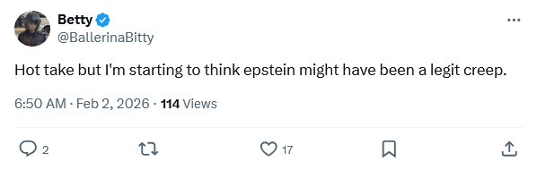 Betty with the hot take!https://x.com/ballerinabitty/status/2018215328585535836