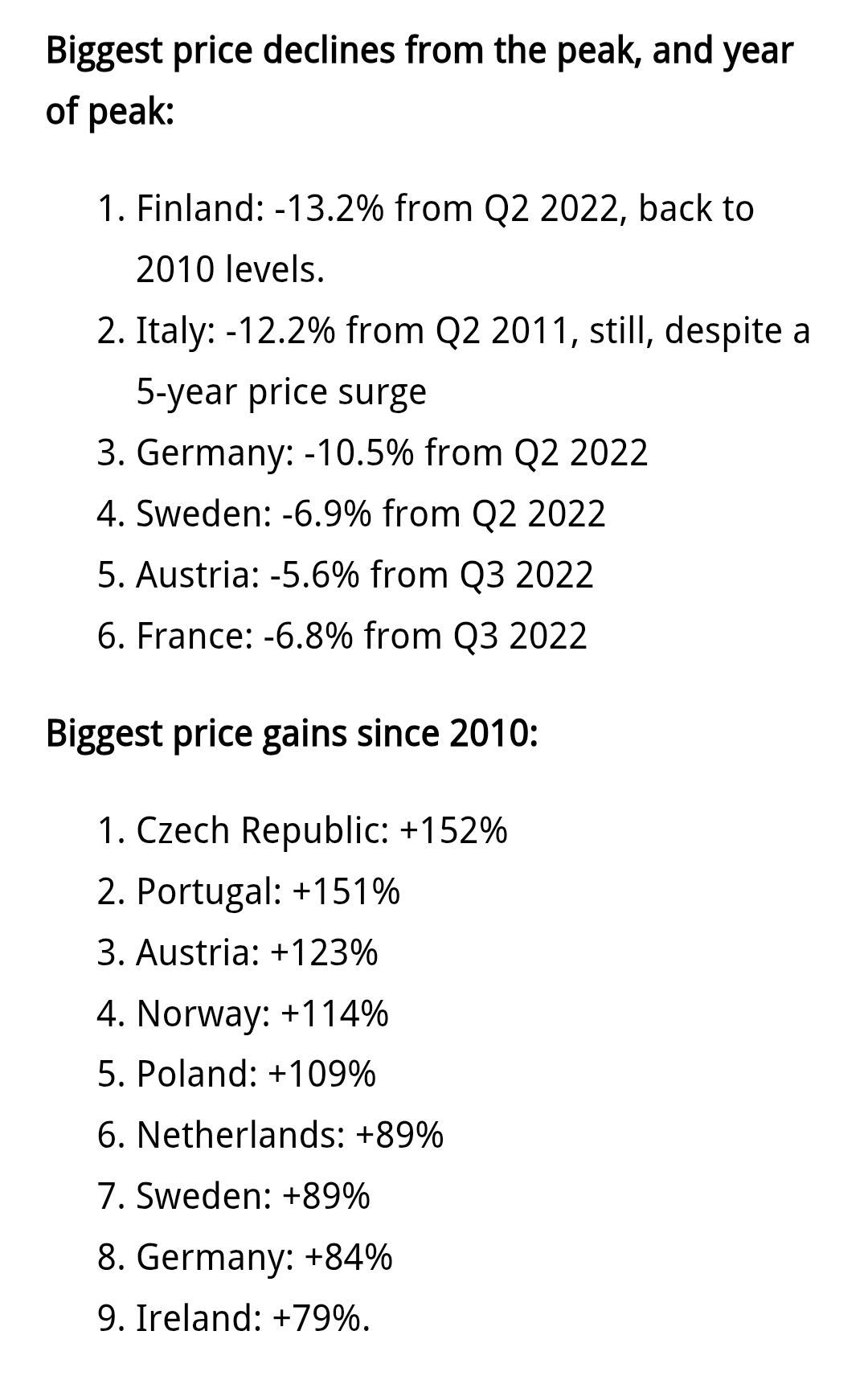 https://wolfstreet.com/2025/10/06/home-prices-in-the-largest-countries-of-europe-they-range-from-splendid-housing-bubbles-to-a-market-that-dropped-back-to-2010/Great piece on European housing prices from Wolf Richter. Most are in a bubble (Poland, Netherlands, Portugal etc), some are flat. Finland stands as an exception with the housing index prices down at 2010 lows. Charts included, check it out if you're interested
