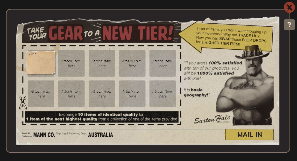 >>23499893Those and the weapon-drop system that ended up obsoleting a Poker Night joke about Heavy chewing through enemy ammunition by picking up weapons. What it's most similar to is the trade-up system that already exists for TF2 items but actually working and capable of producing something valuable, so if TF2 were to get a feature like that, it would probably be a better ROI version of the trade-up system. Five items of any rarity instead of ten items in a crate tier to move up a tier.