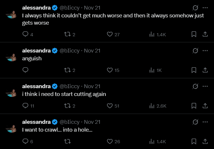 >>23652741Idk she's probably right and I couldn't see it cus im too neurotic.Getting harder to come up with a good enough reason to keep going. Not even over her, just in general.I just don't see the point anymore.If spite is the only point, it's just not doing it for me anymore.
