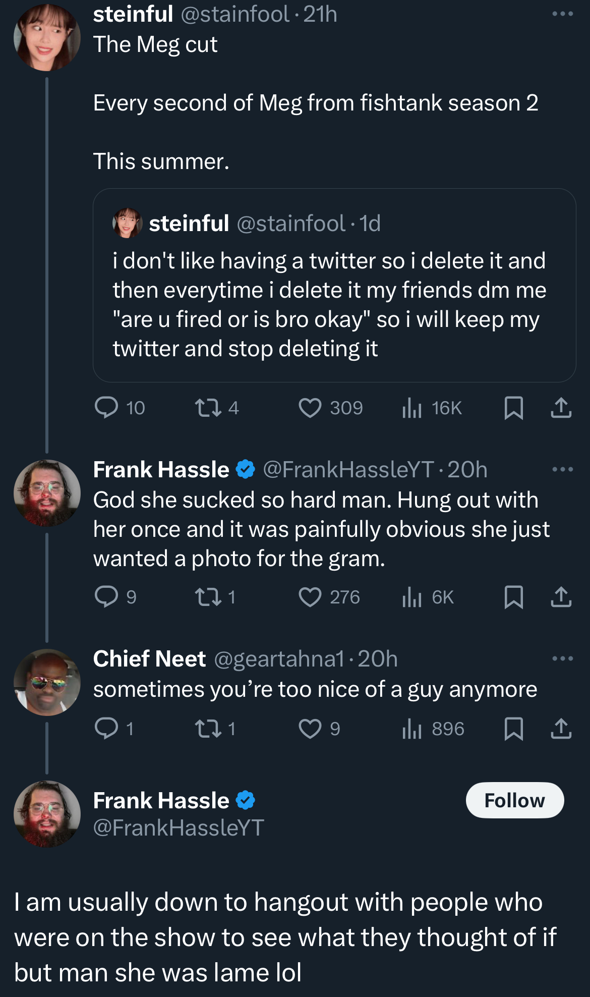 fishtank season 5 will feature renowned ancient energy vampire Alex Stein snuffing out and murdering even the slightest hint of a vibe 24/7 night and day for the entire 5 weeks and 4 days (it ends early because of legal issues).