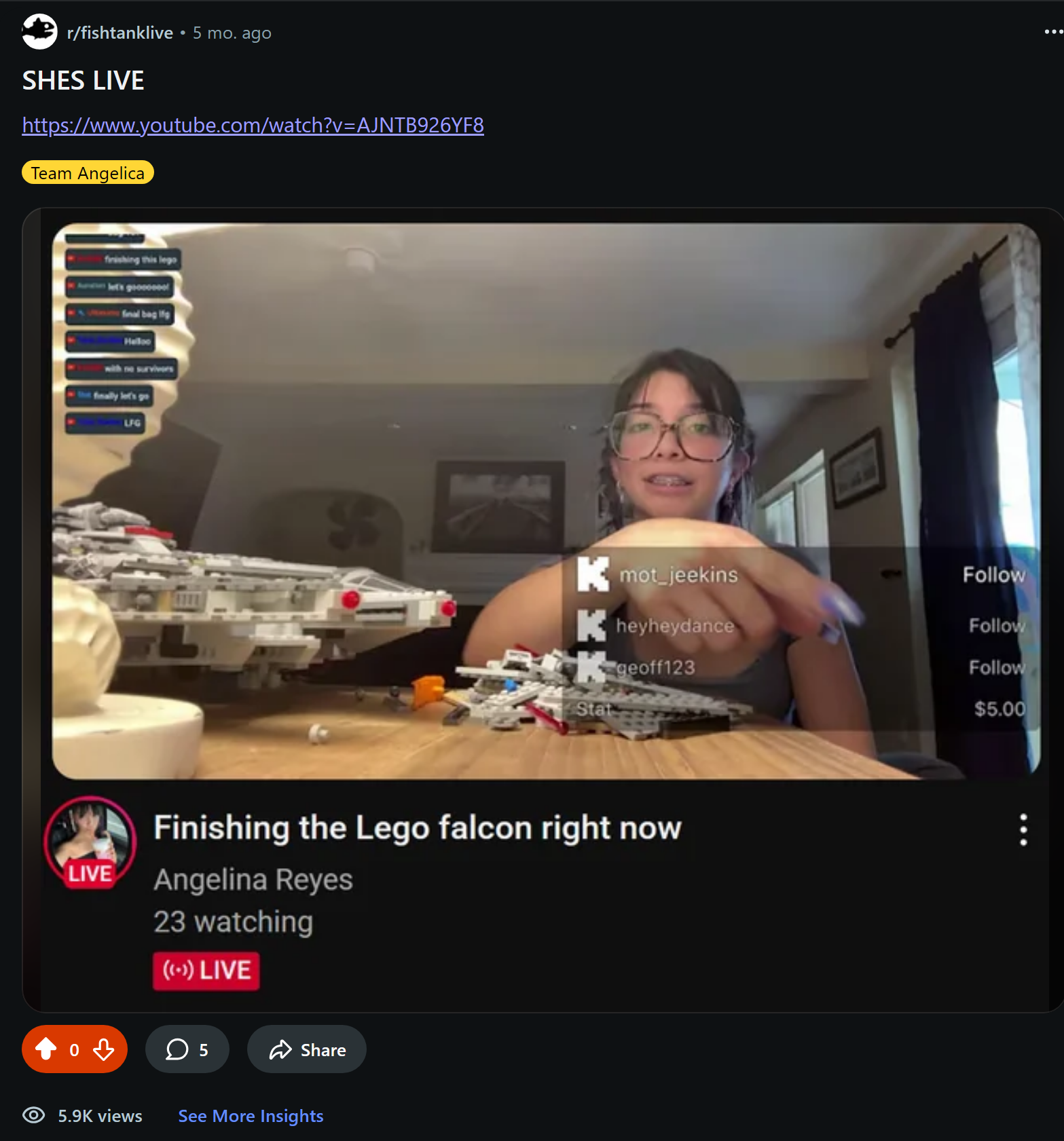 >>23709459https://www.reddit.com/r/fishtanklive/comments/1m55ct9/challenge_accepted_four_minutes_and_twenty_seconds/daily reminder me and Angelina are basically dating