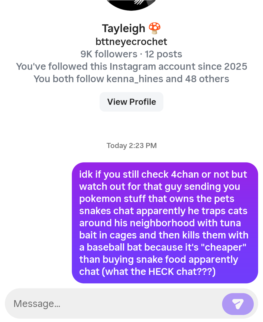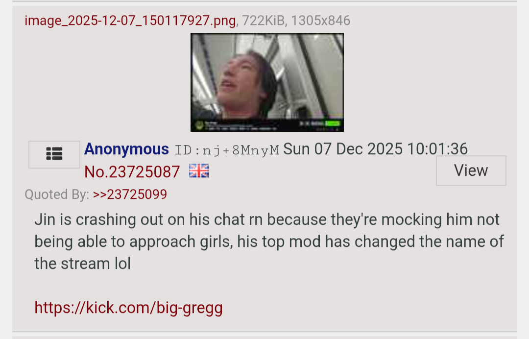 >>23729271I don't know, he likes to abuse his meds and then starts acting loopy. Makes up weird schizo theories about everything. He used to think Betty's painting streams had secret/coded messages that were directed at him.He's also been banned over 20 times now but he keeps ban evading.