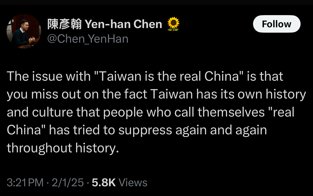 >>23779190Maybe for the very small percent of the population that is indigenous to the island but most of that population was fucked up by the japanese and then the KMT. Call a spade a spade. “Taiwanese” people are overwhelmingly han chinese that fled the civil war. The new wave “taiwanese” identity is recent propaganda to counter a the KMT’s movement toward china via a shared han ethnic background and financial support. This new identity is mostly found in the youth. And we all know who love to start youth movements in foreign countries.