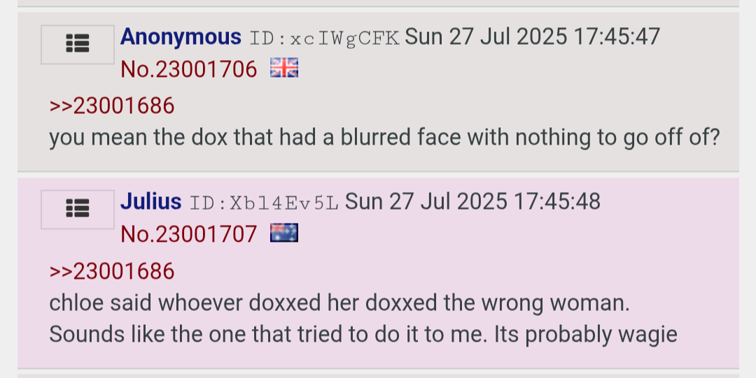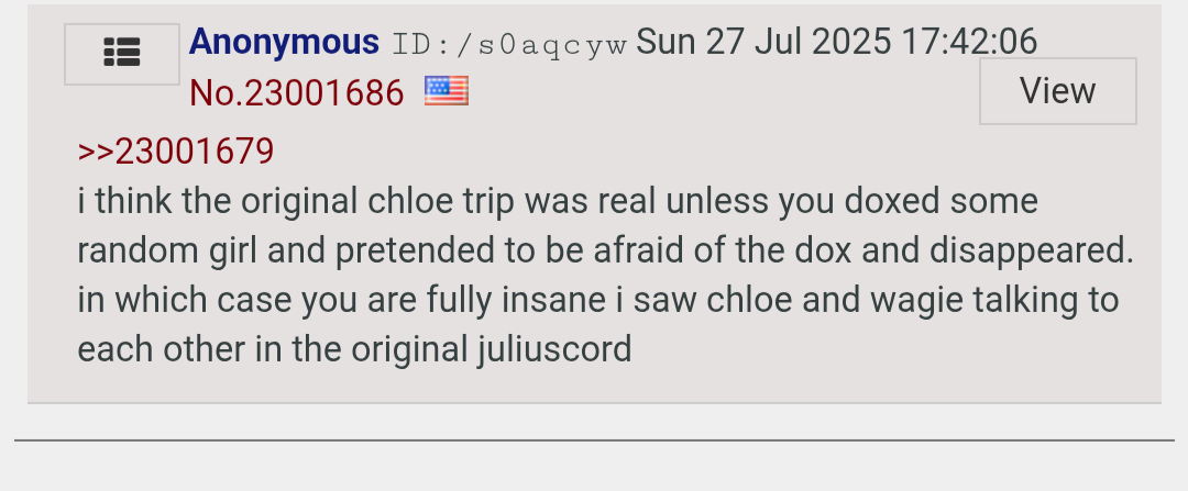>>23784971>wagie larps as chloe to troll julius>fake doxxes to make it more believable but also so he can move on>peggy starts larping as chloe in ellie/julius' discord to push his fetish>starts defending her pedo ex-bf etc. etc.that or he is wagie, anyways