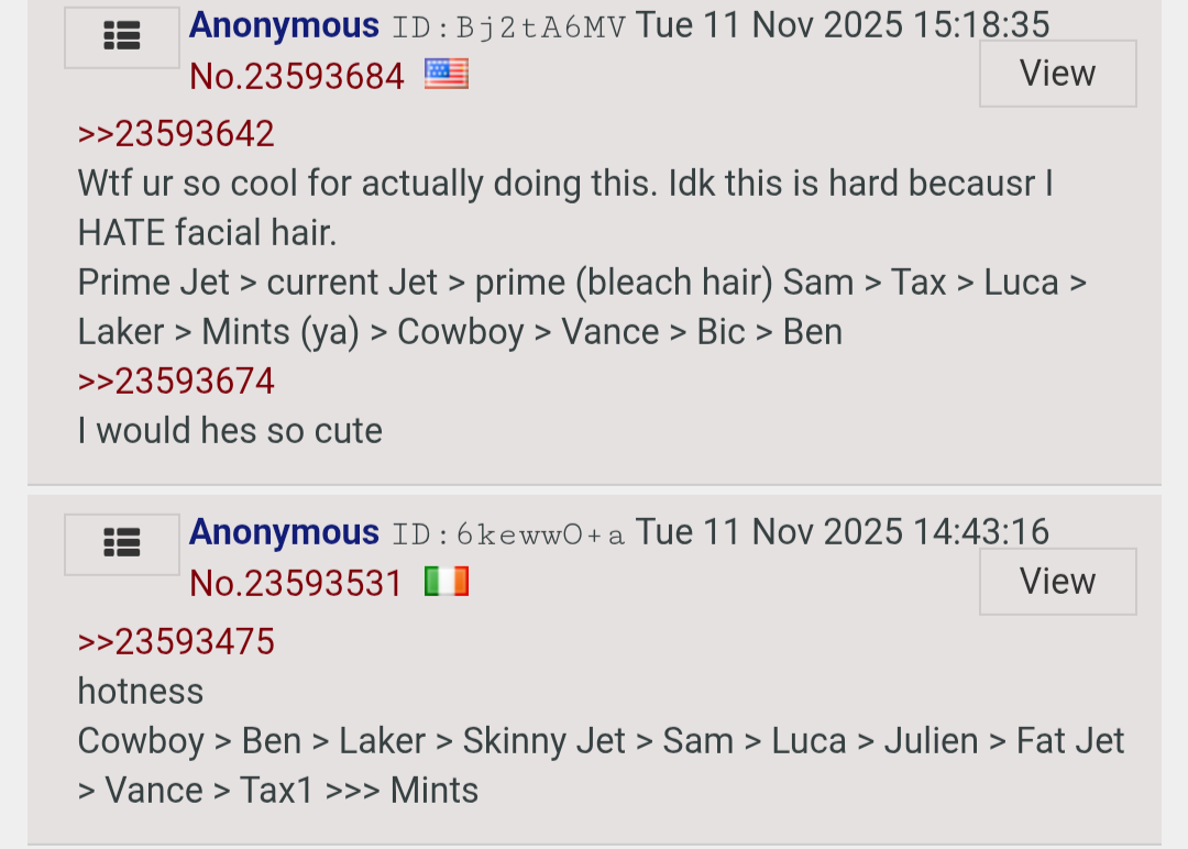 >>23784979>peggy larps as chloe to catfish ellie >wagie starts trolling with chloe name on /tv/>you make a trip and post AI girl>peggy stops posting for one reason or another (like the psych ward, probably fake too)>wagie makes a chloe trip, posts a girl similar to the one you do>wagie fake doxxes to move on>we move back to /bant/>you dont want to commit to the larp here so you dont post>you join the 2nd julius discord, continue the larp and push your pedo shit>post alongside wagie who entertains the larp for the troll>occasionally gloat about the larp with irish flag>you start posting more in November>post a gay guy attractiveness ranking (cowboy first btw)>say your gender is 'mysterious', I dont believe youre a woman>peggy posts a timestamp, looks like AI again>other irish flag starts posting like a woman all of a sudden, more and more often for attentionI sound schizo but just getting my theory out there since you called me out