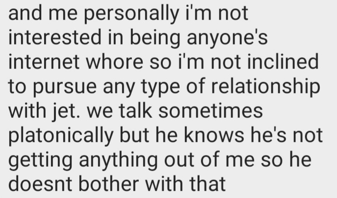 >>23834882Jet only has sex through rape but what’s more repulsive about him than that is his low self esteem where can’t take a fraction of the hassling he inflicts on others without having a tantrum