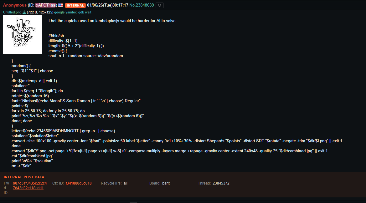 I bet the captcha used on lambdaplusjs would be harder for AI to solve.#!/bin/shdifficulty=${1:-1}length=$(( 5 + 2*(difficulty-1) ))choose() { shuf -n 1 --random-source=/dev/urandom}random() { seq -"$1" "$1" | choose}dir=$(mktemp -d || exit 1)solution=''for i in $(seq 1 "$length"); do rotate=$(random 16) font="Nimbus$(echo MonoPS Sans Roman | tr ' ' '\n' | choose)-Regular" points=$( for x in 25 50 75; do for y in 25 50 75; do printf '%s,%s %s %s ' "$x" "$y" "$((x+$(random 6)))" "$((y+$(random 6)))" done; done ) letter=$(echo 2345689ABDHMNQRT | grep -o . | choose) solution="$solution$letter" convert -size 100x100 -gravity center -font "$font" -pointsize 50 label:"$letter" -canny 0x1+10%+30% -distort Shepards "$points" -distort SRT "$rotate" -negate -trim "$dir/$i.png" || exit 1doneconvert "$dir"/*.png -set page '+%[fx:u[t-1].page.x+u[t-1].w-8]+0' -compose multiply -layers merge +repage -gravity center -extent 240x48 -quality 75 "$dir/combined.jpg" || exit 1cat "$dir/combined.jpg"printf '\n%s' "$solution"rm -r "$dir"