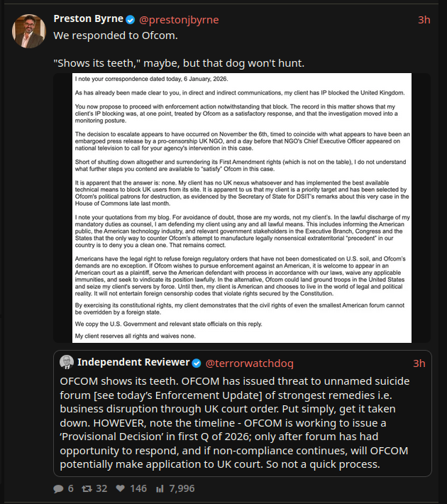>>23850787https://prestonbyrne.com/2026/01/08/the-ofcom-files-part-v-block-harder/mostly related to Brits just being blatantly retarded but pic rel caught my eye>the service is capable of being used by individuals in the UK, and content on the service presents a risk of significant harm to users in the UKHOW the fuck does one comply with the bullshit law in their current interpretation of "being connected to the UK"?