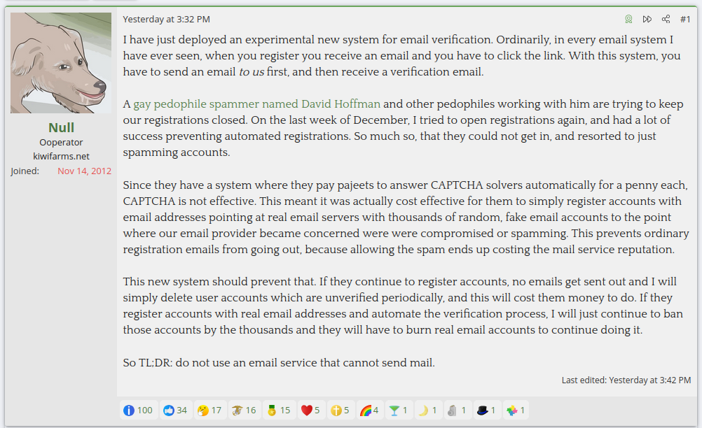 >>23854401>>23854416>>23854418I hate null, but this might be a good idea. The only issue is that getting around it isn't that hard. But at least it will stop random people from getting spam emails from his shitty green reddit.