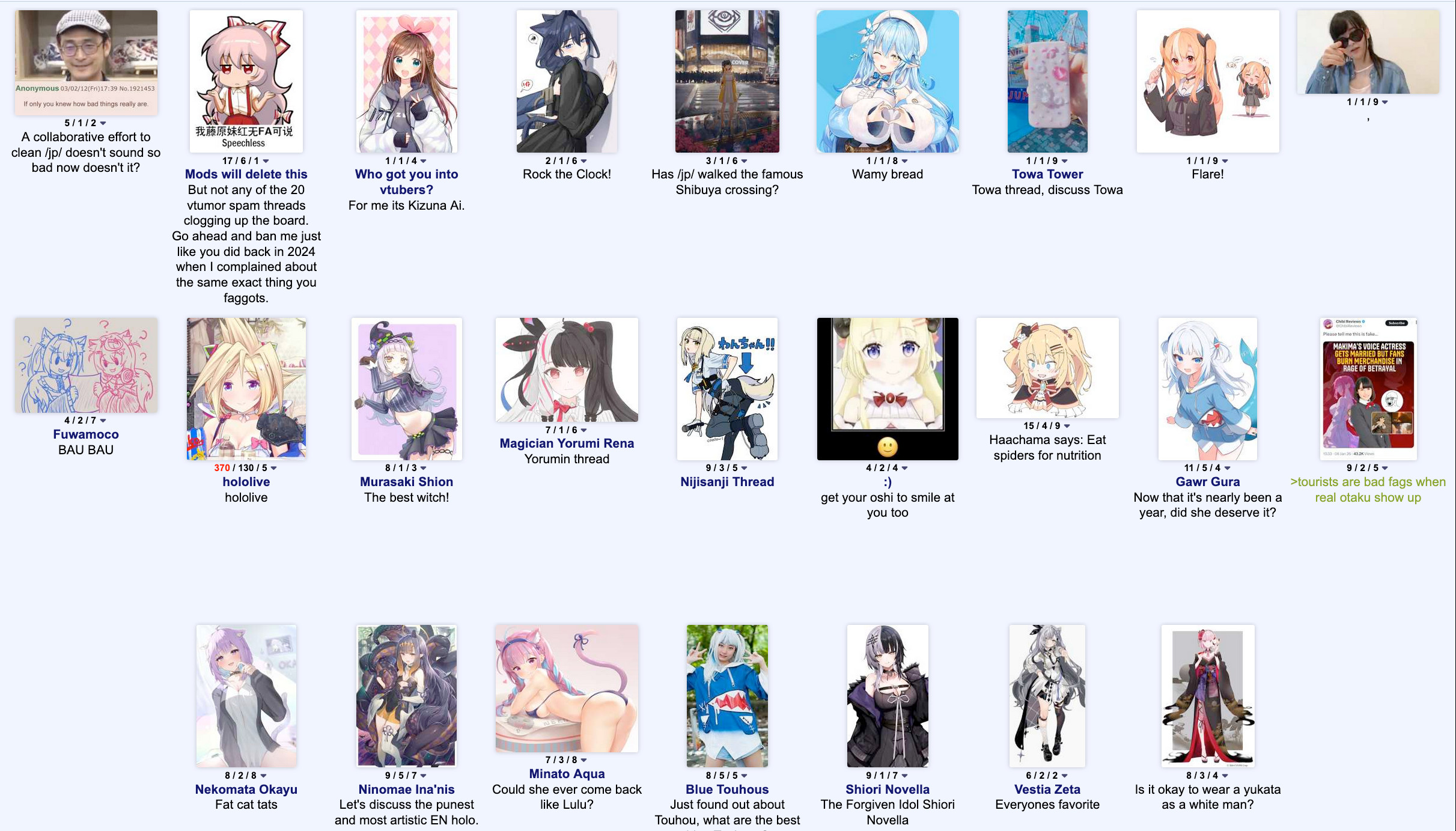 >>23857934those are the schizos that remained on /jp/. Holofags are mostly gone from 4chan. /vt/ is a husk of itself.and /vt/ was made to contain the holoEN sharts, holoJP fags remained on /jp/ because they are Japanese and were self-contained to a thread. Now both EN and JP moved onto holotower.