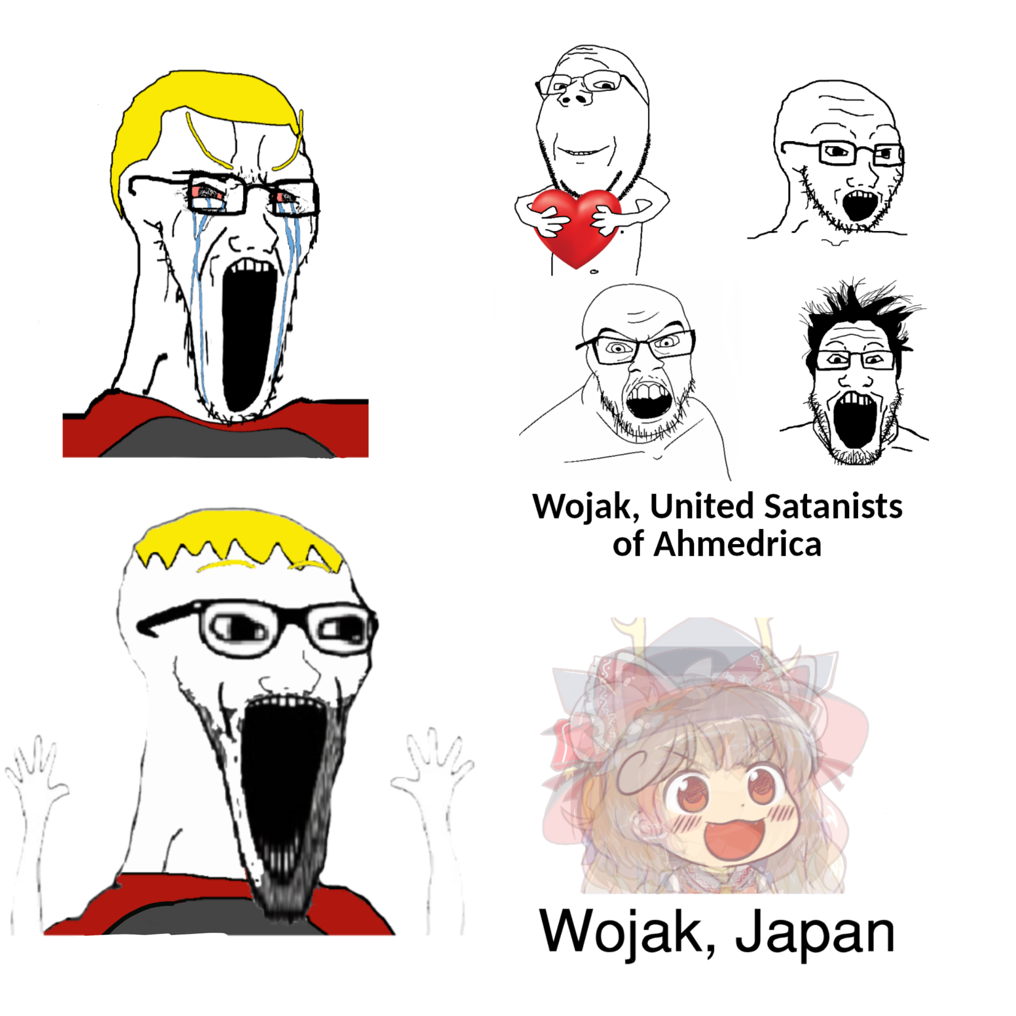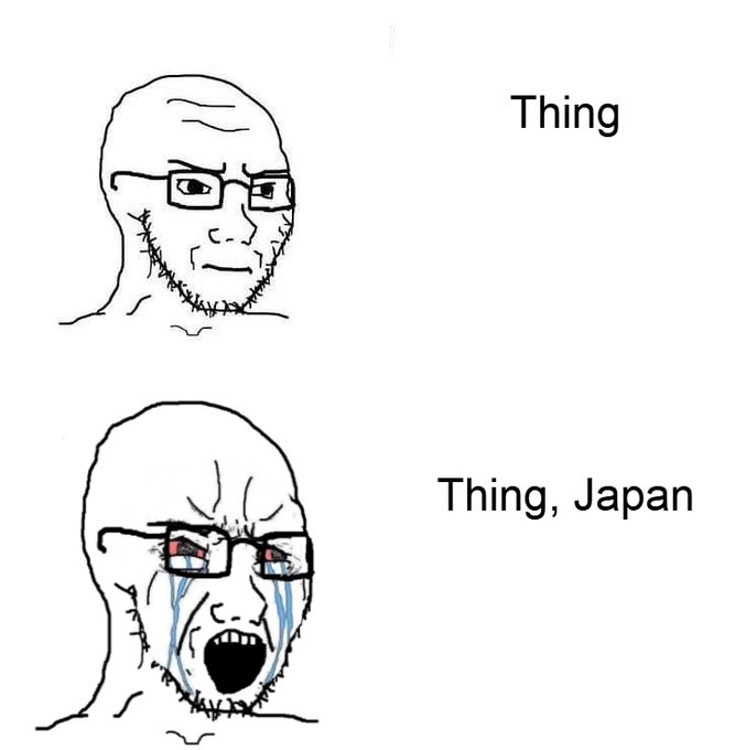 Japan: "let's make our memes cute and a pleasure to look at!"the west: "let's make our memes the most grotesque and unsightly caricatures we can think of and have them drawn by a teenager possessed by Satan himself!"