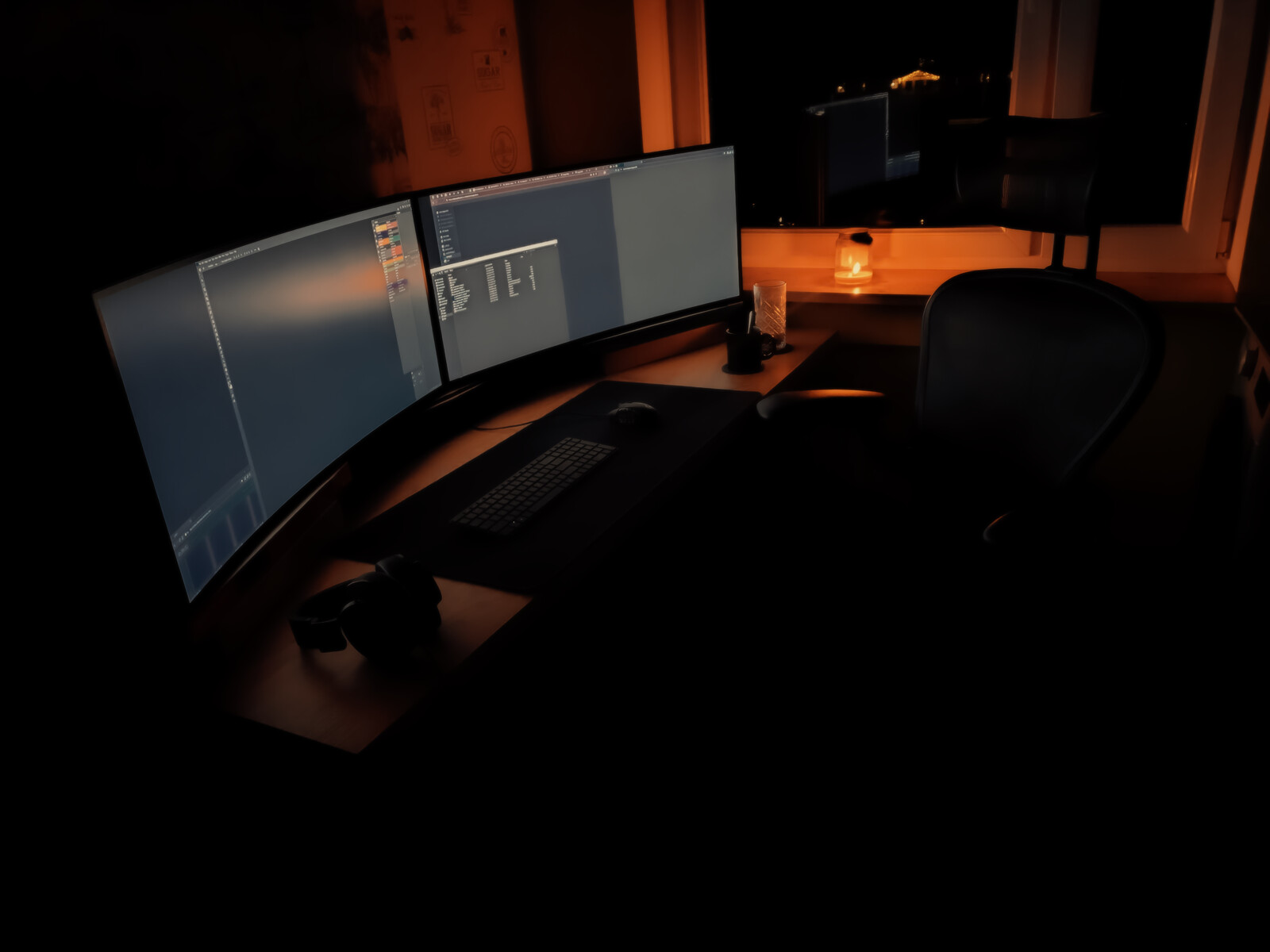 Recently got my own apartment and now work from home, have a temp setup in the kitchen because main room gonna have some minor renovations, had electrical issues in the kitchen so no lights but thankfully extension from hallway reached the pc.