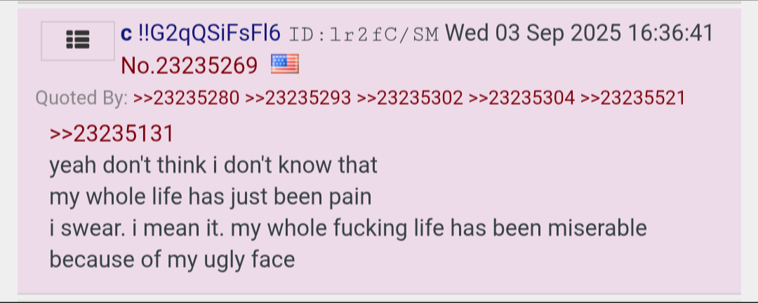 >>23887597Whatever helps you seethe at me and not blow your brains out/cry to sleep every night.