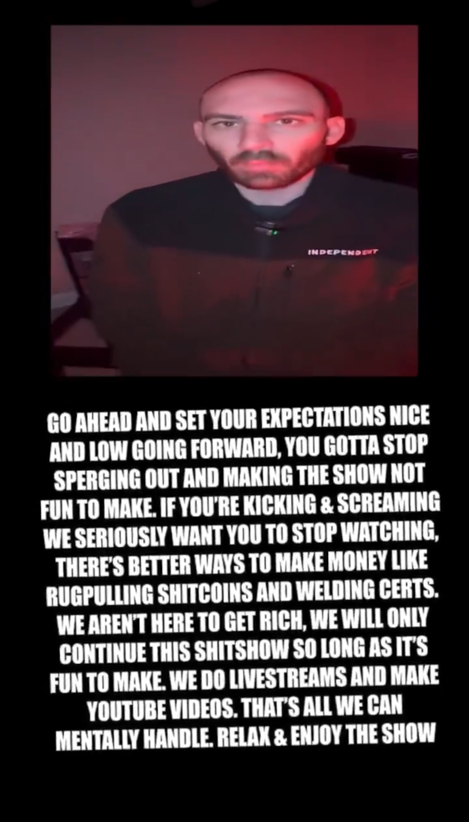 >>23887632>>23887670they're just saying shit it has absolutely no meaning.remember when jet told his shit eating fanbase to tell their friends and relatives about fishtank so they can get multi million investment so he can make a space ship and pirates?its just empty words