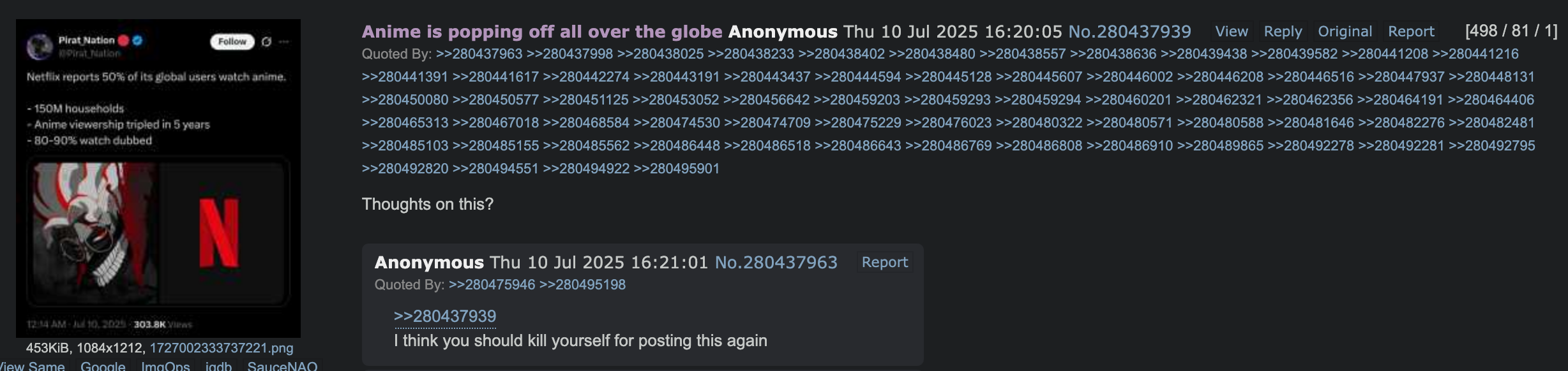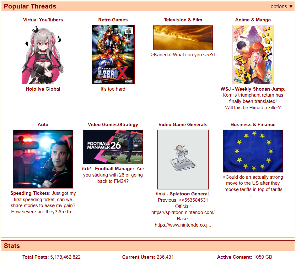 >>23911125yes but how would that make japan's N° 1 grifter scammer money?>>23911129honestly I don't know why they haven't moved to a self-hosted matrix instance instead of pisscord who may just flip their lid and nuke the server.>>23911131me? but i'm too poor to pay a server!>>23911137>who else would care about iichan in 2026?4-ch (textboards) people, heyuri people>what textboards?There's a small 4chan retro scene and VIPPERs are metafags par excellence.