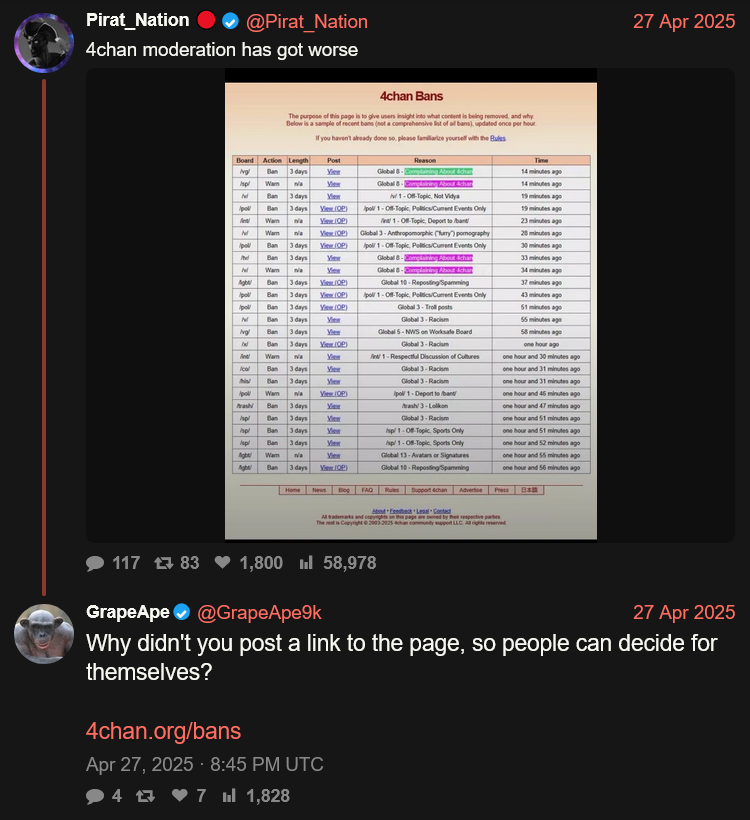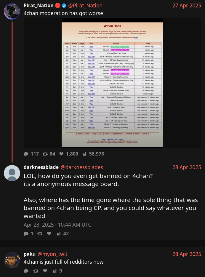 >>23911127>i tried to haaaank at him because every time they appear in the open we get a wave of retards using /hap/ as their personal report button.That's going to happen whether or not a mod posts ITT. Hell when a mod shitposted with the capcode when we were on /r9k/ the thread archived before hitting bump limit.This isn't really related but it's funny: RapeApe once replied to a shitpost on /qa/ with the manager capcode and locked the threadhttps://desuarchive.org/qa/thread/4046766/#4049329>>23911125>>23911129@4chan bitching at agencies and politicians would be funny. I'm sure it would generate a lot of ad revenue if he posted epic screencaps or something, too. I want to say it's weird Hiro is neglecting it (he posted about making money from X on his personal account) but IIRC he doesn't really understand Western Internet culture at all.