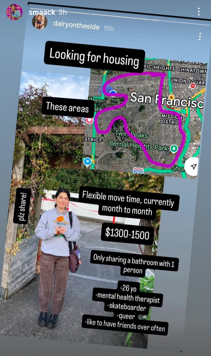 Please help smaackie find her friend queer friendly housing in San Francisco.