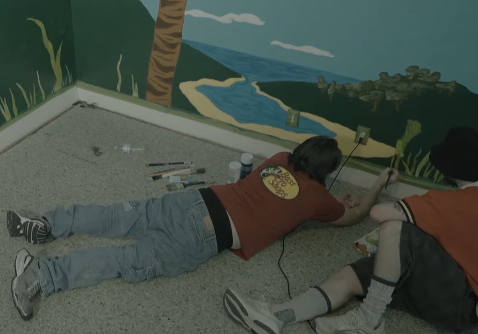 jet and ellie spending the night painting the jungle room together