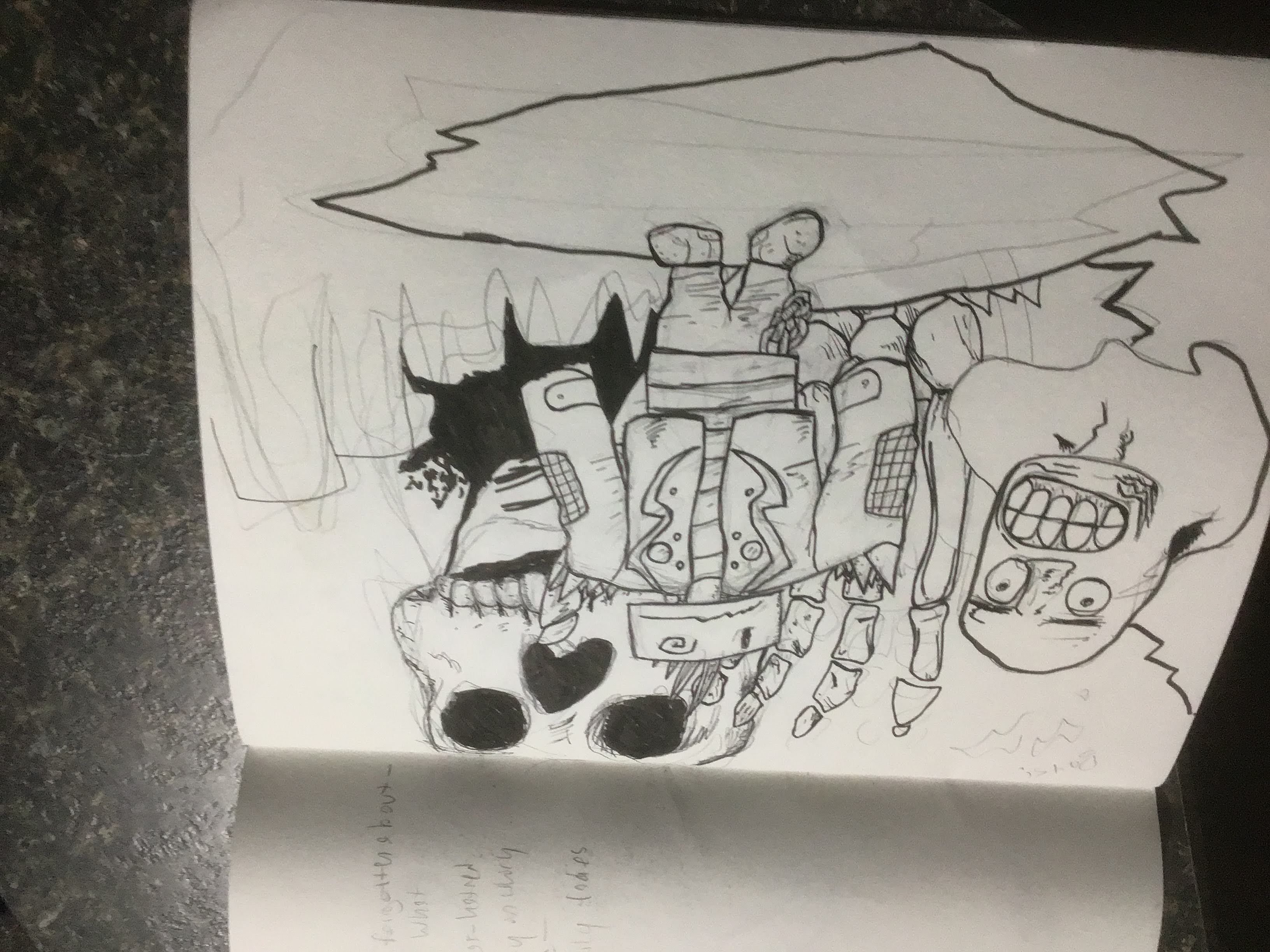 even pictures like this, a lot of people liked this picture for some reason, it was based on my idea for a character I randomly came up with as a teenager called "frankenboy" I think it was my best attempt at just expressing the emotions I felt at the time, I felt severely disconnected and broken It's basically a similar design, but it's a little different, the main figure basically finds themselves in a world where there's lots of color, and possible beauty, but instead they are relegated to coldness and disconnection instead unable to fully be a part of the worldI think a lot of it was also what my problem was, I think my ego was broken and I had to really break free from it and experience and ego death because (like I said) having a really dysfunctional "ego" and thought processes are really fucked up and is quite the experience to have I guess. I had to consciously overwrite and destroy my ego entirely, which I did do, I reached enlightenment actually and all my feelings came back to me and everything it was miraculous but then my father died and I haven't been able to obtain enlightenment again since.But anyway, I realize now a lot of my old art has something to do with the fact that I was almost murdered as a child, but I got amnesia and forgot it all, but it still came up through my subconscious all the time.