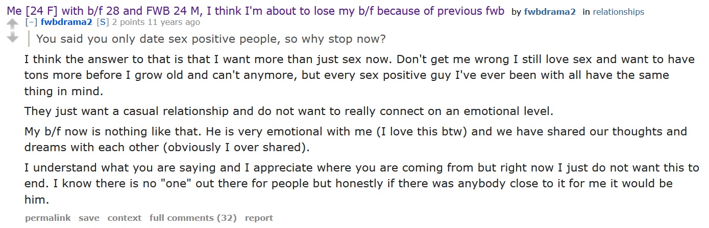 Found this absolute banger an hour ago while dumpster diving about the state of "romance" today. One of their comments later is about how great it's been exploring her sexuality with this FWB but wants true love now.