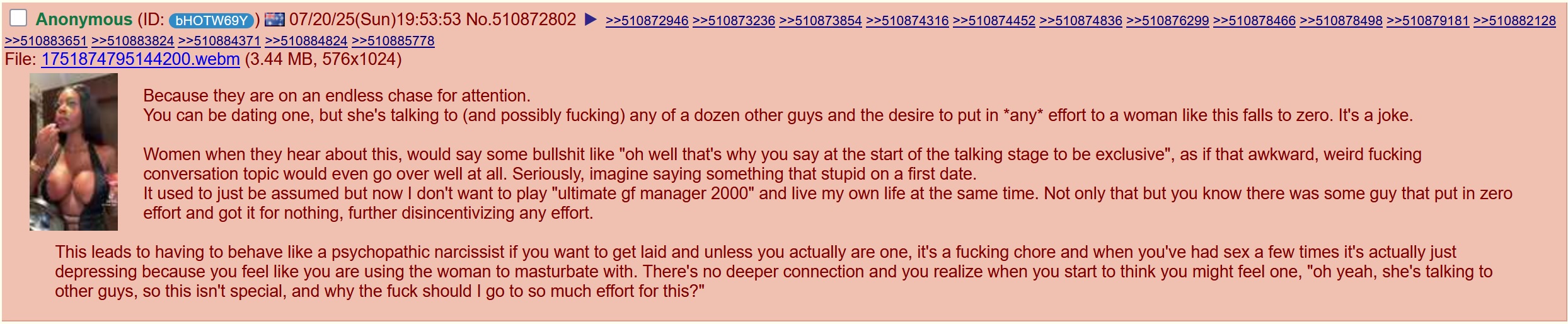 >>24007179>>24007180>be me>32 years old>6'3">185 pounds>6-pack abs>athletic physique>great hygiene>not bald>dress nice>not shy>respected by colleagues>122 IQ>multimillionaire>nice face/jawline>don't need a beard because I actually looked good>can easily do basic maintenance on a car>highly knowledgeable on many subjects>don't smoke or do drugs>have 1 alcoholic drink once a week>b-but he should be rolling in p-pussy!!! Reeeeeeeeee!!!!!!!>also me>lives in the rural midwest>doesn't have a college degreeThe only thing that actually matters is proximity and a woman's emotions at whatever random moment in time.I used to do merchandising for a few local bands back in my late teens and early 20s. Women cheat on their Chad quarterback boyfriends with ugly broke losers all of the time. It's just about how she feels in any given moment. Until you realize that the vast majority of people operate completely on emotions and short-term gratification, your stupid redpill/blackpill/bluepill shit is useless.Women care more about status than they do about wealth or looks. That's why they constantly cheat on good-looking men and rich men. And it's also why fat ugly weirdos that become popular on YouTube end up dating those petite e-thot looking women. Because they have status.If you work or live in an environment where there aren't many women around and the women that are around are fat white-trash, then you aren't going to have much luck, because the 50 hot women in a 50 mile radius have 5,000 hot men to choose from. And if you don't have a college degree or a prestigious career you're automatically filtered on the dating apps, even if you're rich and good-looking.The simple fact is this. Women make their own money and don't need men for anything except sex and a travel buddy to show off to their girlfriends. Men make their own money and don't need women for anything except sex and a companion so they don't feel bored/lonely on the weekends.