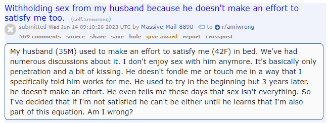 But she's gatekeeping her husband to sex, probably not the first time since he had to tale her out on multiple dates, pay for them, be respectful & kind, and have serious conversations before he even got a crumb of pussy.
