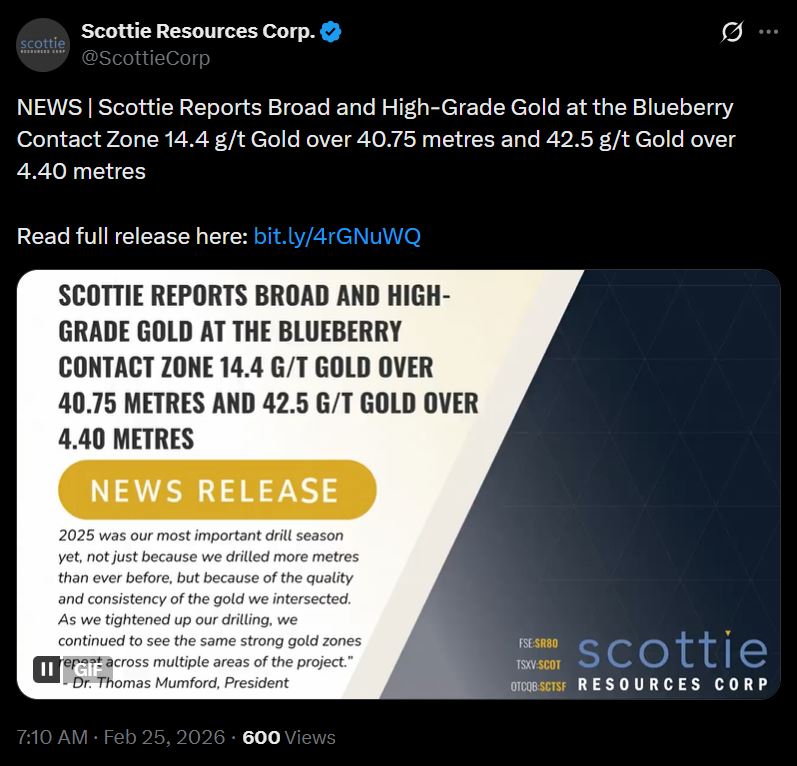 SCOTTIE keeps hitting bigger and bigger intercepts! In a related story I sold 2,000 of my most expensive shares last week for a measly +$400 gain and now have only 8,000 shares left. What I thought was a disciplined de-risking and smart lowering of my average cost basis was actually confirmation of my retardation https://scottieresources.com/news/2026/scottie-reports-broad-and-high-grade-gold-at-the-blueberry-contact-zone-14.4-g-t-gold-over-40.75-metres-and-42.5-g-t-gold-over/