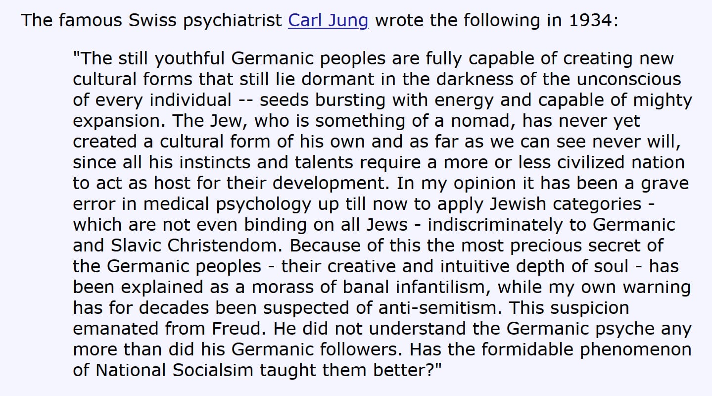 Based and true. Jung brought me out of Nihilism and helped me better understand why humans need religion as well as how important archetypes are. He was maligned because he spoke out against the kikes and the nazis.