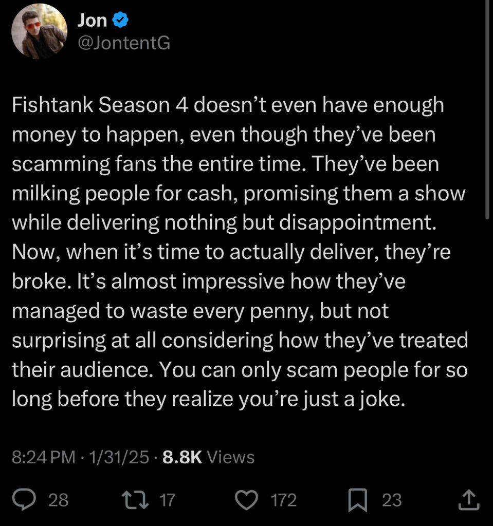 I am Fishtank you ungrateful fucking stains ME I made this fucking show I will continue this fucking show and I NO ONE ELSE WILL END THIS FUCKING SHOW. You fucking worms can’t stop me you can fucking stop me read that again you cannot kill fishtank you cannot kill me
