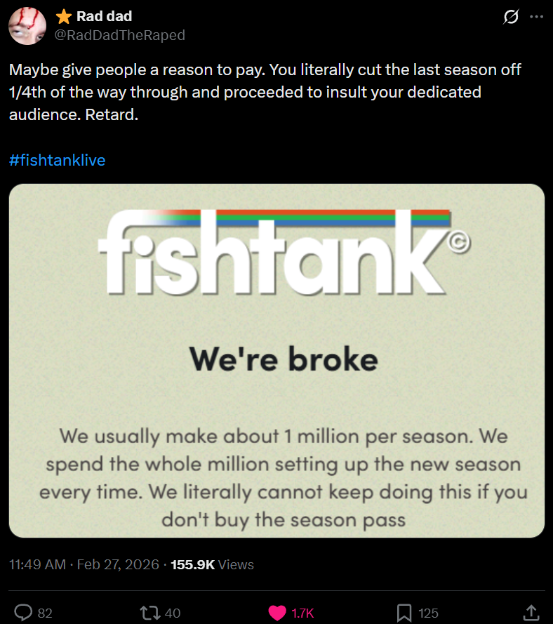 Tight little penis edition>FTL NEWS:-- S3 episodes release weekly starting Sunday March 8th! https://x.com/fishtankislive/status/2027573383261544585-- Two seasons happening at once... are the wiggers RETARDED?-- Estanque is LIVE! https://elestanque.live/-- SEASON 5 STARTS MARCH 15TH https://x.com/fishtankislive/status/2023951871514149321-- S5 location: Sandy Springs GA, duration: 30 days, S4 fish not returning, and Sam OBVIOUSLY STILL IS hosting!>Links:https://www.fishtank.live/https://x.com/fishtankislivehttps://old.reddit.com/r/fishtanklive/https://www.instagram.com/fishtank.live/https://www.youtube.com/@fishtankislive/videoshttps://fishtanklive.fandom.com/wiki/Fishtanklive_Wikihttps://elestanque.live/https://x.com/Estanquedotlivehttps://www.youtube.com/@ElEstanque_LivePrevious: >>24063824
