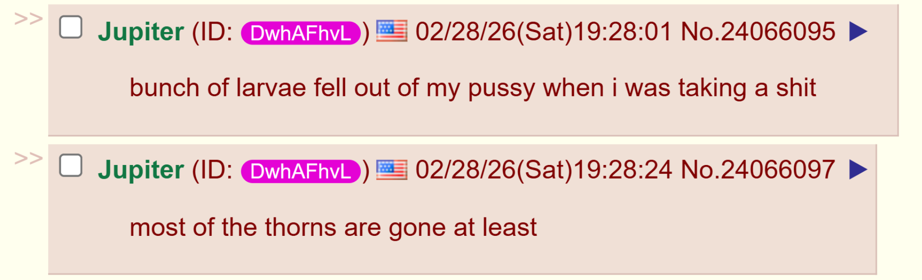 bunch of larvae fell out of my pussy when i was taking a shit