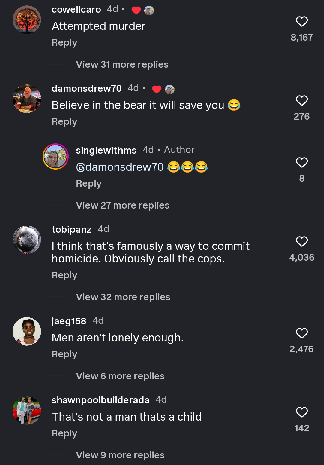 I think this woman secretly hopes something like an "Alpine Divorce" happens to her so she can live out her victimhood fetish. Instead of facing that she's insufferable and undesirable if men are all psychopathic monsters she doesn't have to take responsibility for being alone. This is a mentally ill person clinging onto an insane fantasy to avoid facing the fact that her loneliness is her fault and her fault alone.