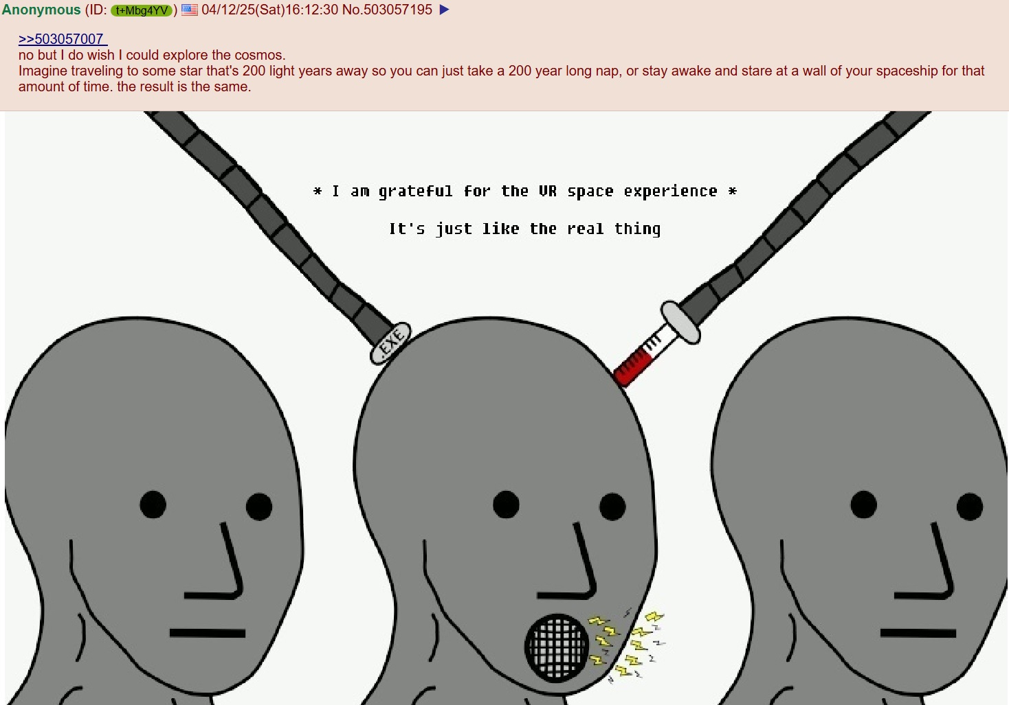 >>24105115>how visible are we? Very visible to things within our galaxyWe can’t see shit right now but we have like 1 3 meter wide telescopeAliens could have much better telescopes of all kinds just by the scale of industry, and if they’re wise they would build such things to detect others before they are detectedIt’s what the trisolarans do in the books, they are a high Darwinian fitness civilisation. Utterly totalitarian collectivists, 100% of the GDP is centrally planned and goes towards interplanetary warfare. And their first move is to turn their entire planet into detector arrays. Covering the entire planet in telescopes and turning off the lights. It’s a smart thing to do >Our radio signals have only progressed about as far as to reach Alpha Centauri. More than likely, no life exists in our solar neighborhood.HopefullyOur telescopes are currently too small to see anything lf it was there> With so many planets out there, we blend in so well that finding us would be like trying to find a particular grain of sand in all the beaches on earth. We are essentially sitting in "the boonies" and it's almost impossible to find us. Grabby aliens that take the approach of just taking over EVERY star would be pretty good at finding us don’t forget that >I believe in the dark forest theory. People who don’t are insane>Anyone advanced enough to be easily seen and contacted due to them being travelers with obscene technology have already met "the big boss" and got borg'ed by something unimaginably unstoppable. We won't last long enough to be relevant to them.Sure but there’s possibility we will meet aliens we could defeat if we focus on becoming stronger now, that would defeat us if we don’t