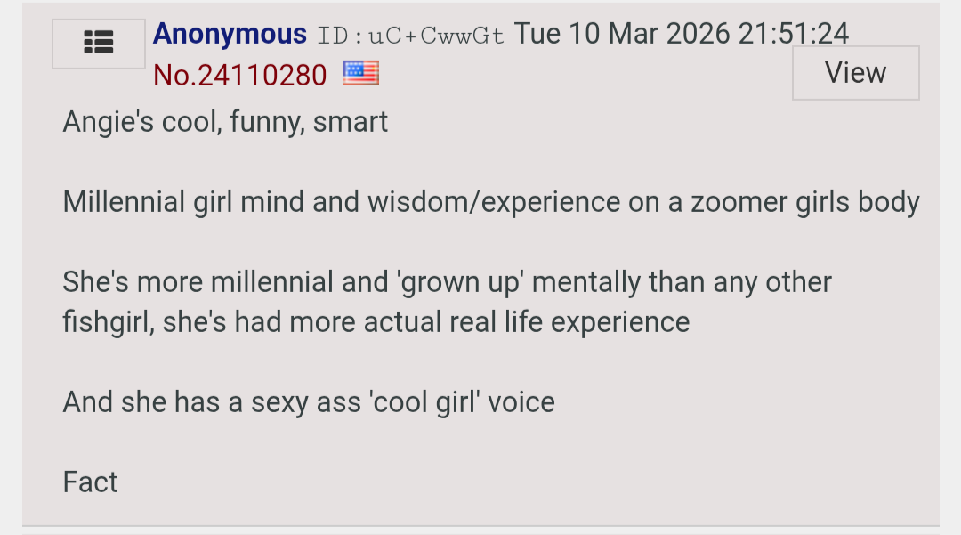>>24122943the binx thead is her favorite piece of entertainment. She for sure takes a spin on here to get the news of the day.