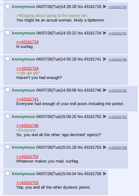 ITT: Interesting and unusual stuff that's happening on the boards you visit.Non-happenings, habbenings, haqqenings, small GETs, complaints about shit boards being shit, known spergs sperging out, personal report buttons and blogposting / avatarfagging et al. belong in the nonexistent /nah/ thread at >>>/bant/nahPremium happenings, goldppenings, diamondppenings, rare GETs, great posts from great boards, users loved by everyone, secret meetups with mods and exclusive entries in blog.4chan.org belong in the 4chan pass-only thread at >>>/vip/happeningsPast happenings: https://wiki.bibanon.org/4chan/HistorySee how active 4chan boards are in real time: https://4stats.io (charts are back!)Search 4chan: https://find.4chan.orgArchives: https://wiki.archiveteam.org/index.php/4chanSelf-serve ads: https://4ch-ads.pages.dev/Enhance your 4chan Experience (no 4chanX): https://rentry.org/4chan_Userscripts_1Enhance your 4chan Archive Experience: https://rentry.org/FoolFuuka_UserscriptsYotsuba catalog: https://catalog.neet.tv/4chan media browsers: https://thread-puller.party/ (Images) & https://www.4webm.org (Webms / [wsg])How to access IRC and contact the mods: https://desuarchive.org/qa/thread/1654916/#1690512Previous: >>24184048 | https://archive.palanq.win/bant/thread/24184048/