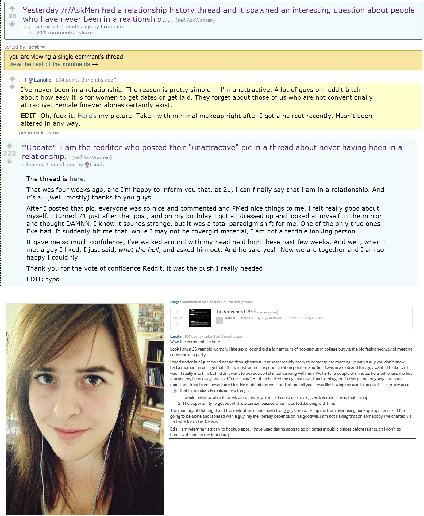 Complained about never have a relationship, about how guys say it is easy for women to get men and have sex.She ended up putting in literally the tiniest amount of effort and got a bf. Then a year or two later they aren't together anymore and she claims to have done a fair amount of hooking up after him.Women are lonely because they don't put in the tiniest amount of effort.>I know the dates in the image are fucked up idk what the guy who made this image did, all you need to know is the posts go from top to bottom chronologicallyPretty sure she also got a breast reduction after this