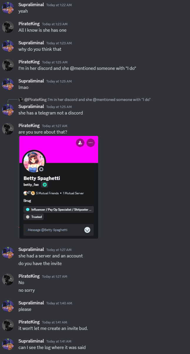 betty's only stipulation for talking to me privately was that i "be nice" and i didshe nevr said anything about "IF U SAY IM TALKING TO U ITS LEAKING AND I WILL TRY TO MAKE U KYS REEE"i didnt do anything wrong and she flipped out and attacked me so wever. everyone else is mad she was talking to me idc about that either she talks to lots of ppl so fk offit doesnt even matter now it never did it was tranactional i dont like her because shes a bad person simple