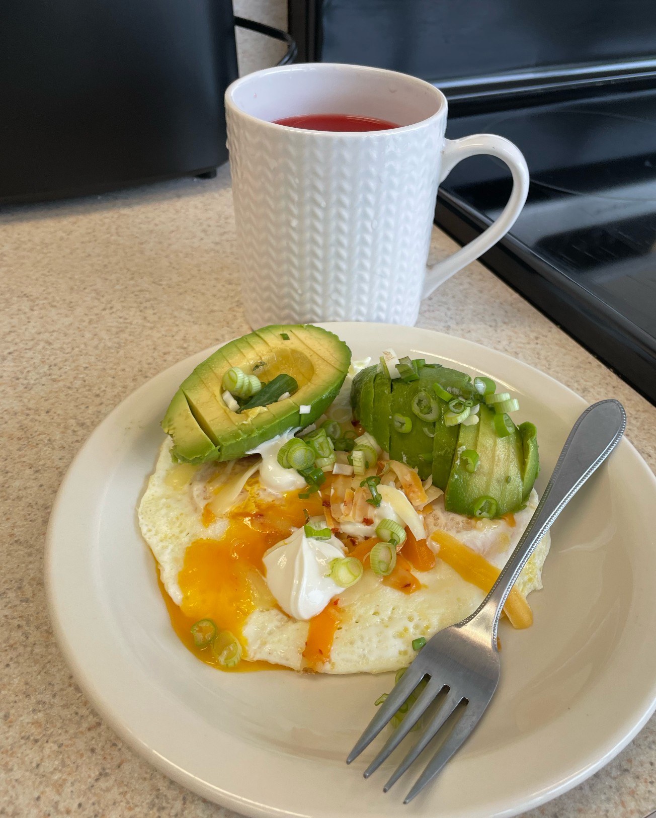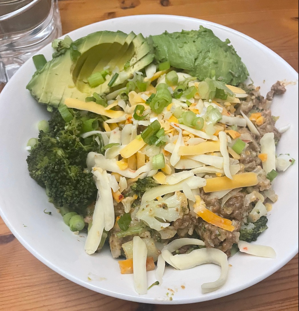 keto breakfast is so easy and delisheggs, avo, sour, cheese n butter w/ green onion