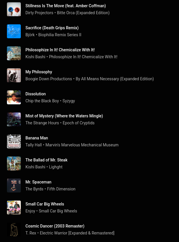>>24237433dirty projectors, kishi bashi, t.rex she has some weird varietysome mucore like the uncicorns and xiu xiu as well weird mix of hipster and rap and korn and stuff