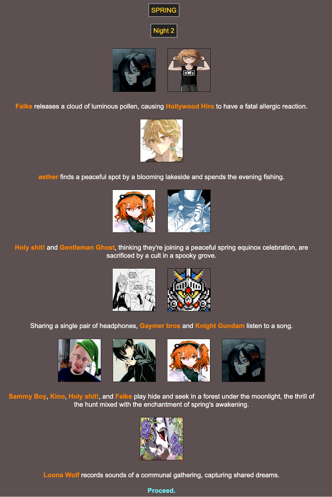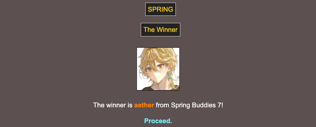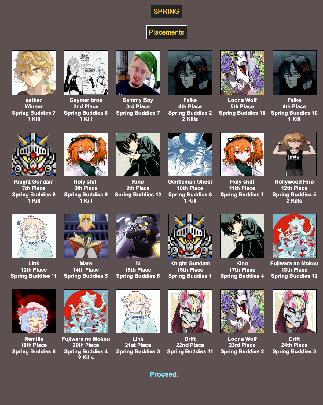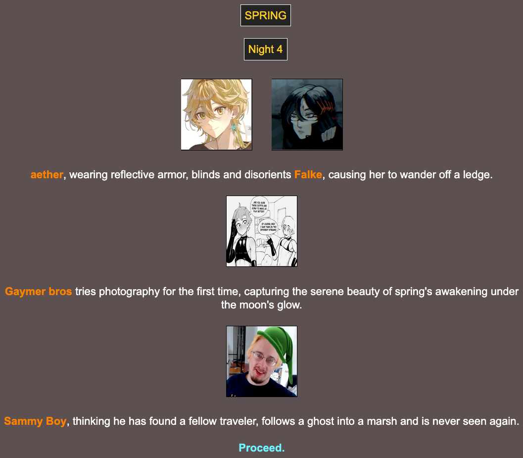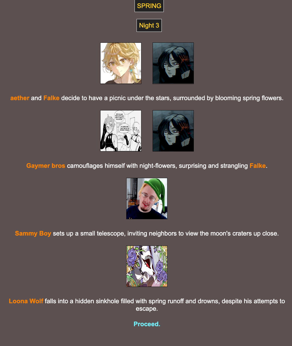 >>24252571Nooo, I was rooting for the cute gaymers.>>24252588I couldn't agree more. I hope this ends up working out!>>24252589N: GG everyone, thank you mysterious host person for hosting such a fun game!H: And congrats to Aether!