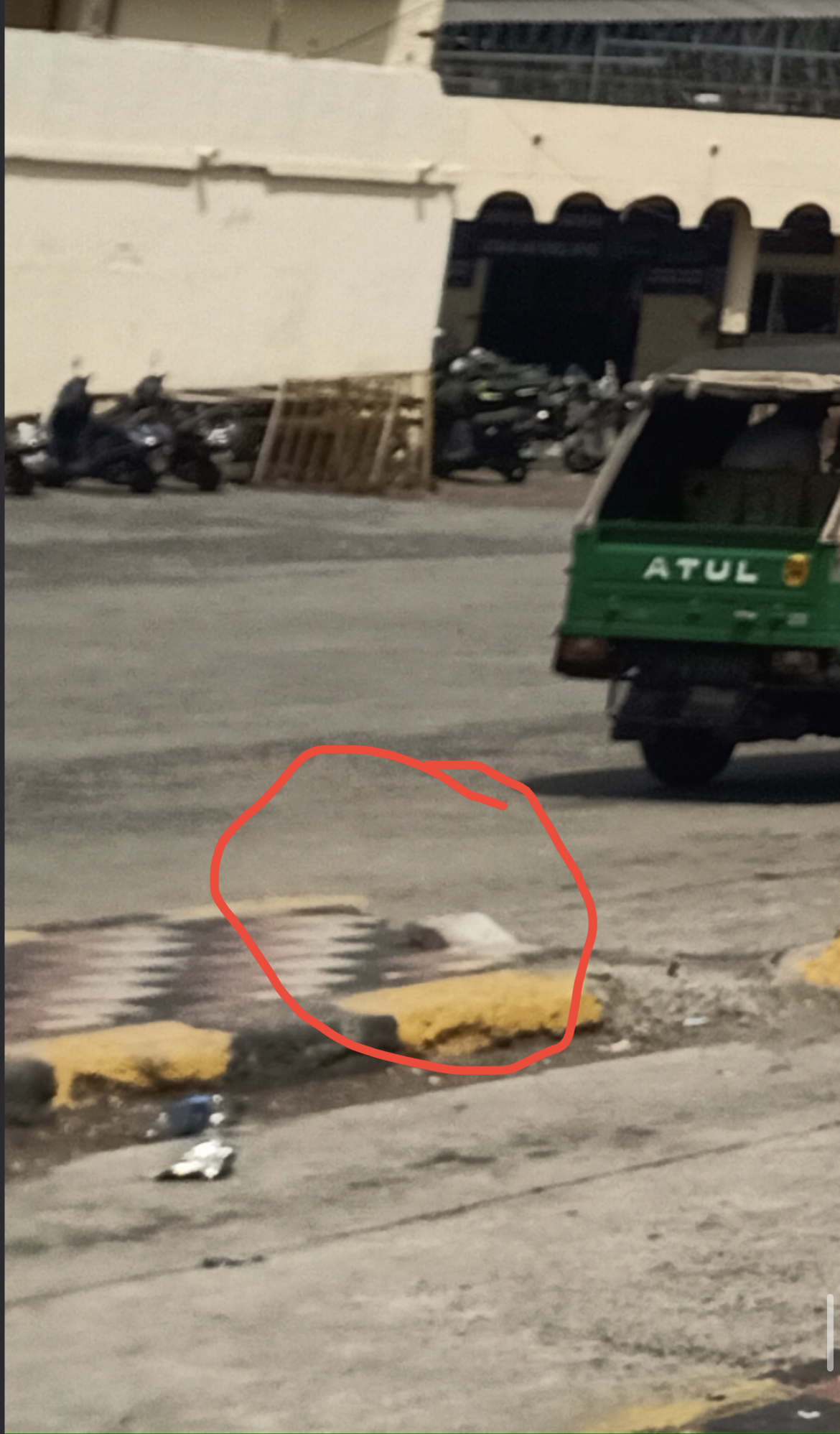 Looks like a broken brick on the jacked up "modified" median. If I had to guess they removed that front 100' or whatever to facilitate parking.