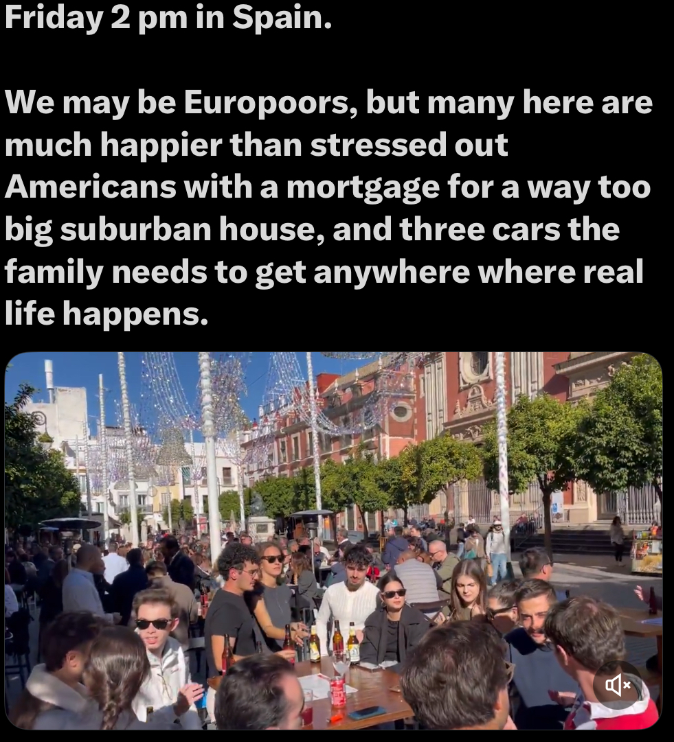 Spaniards live far better lives than americans and northern europeansAmericans wish they could have the spanish lifestyleWalkable cities aren't even a thing in America, european countries have a sense of community and nation that America will never have, you don't have to pay an arm and a leg to see a fucking doctor in Spain.Spain has the largest high speed rail network per capita in the world.