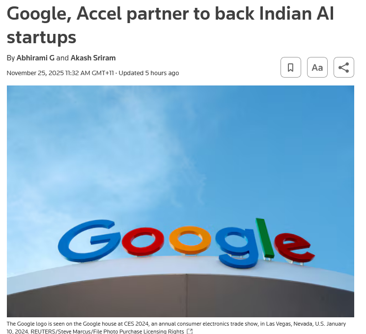 >Alphabet's Google and venture capital firm Accel will partner to fund at least 10 early-stage Indian AI startups, marking the U.S. technology giant's first such funding partnership, top executives at the companies said on Thursday.>The move comes as several U.S. tech firms like Microsoft, Amazon and OpenAI make a beeline for the world's most populous nation, seen as a critical growth market where nearly a billion users access the internet.>The announcement comes after Google in October said it would invest $15 billion over five years to set up an AI data centre in the southern Indian state of Andhra Pradesh, its biggest-ever investment in the country.>Its AI Futures Fund, launched six months ago, has funded over 30 companies, including Indian webtoon startup Toonsutra and U.S.-based legal-tech firm Harvey. Google has also teamed up with India's largest telecom operator Reliance Jio to provide free access to Gemini AI for 505 million users.