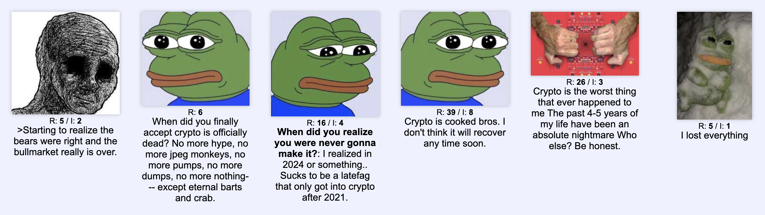 >Check all the memes that were inecessantly spammed here for a year straight>Literally all of them are down 99%>Check telegrams>Baggies still coping thinking retail is coming to save themHoly.. imagine being one of these losers that fell for ''Le organic community shitcoin'' meme, hahaSome of these people had MILLIONS they held onto into literal dust, and ITS NEVER COMING BACK!HOOOOOOLY SHIT MUH FROGS VS DOGS. LOL!??