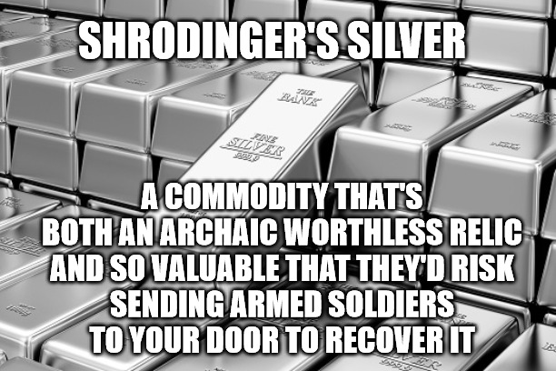 Right now as we speak during christmas when everyone is busy in the festivities and there no volume the cme group, jp morgan,hsbc,BIS, and us treasury, held a secret meeting that lasted 47minutes to suppress the price of silver at $75, there is a 1.1b ounce shortage of silver at comex and if the price keeps pumping then these banks will be liquidated and trigger a systemic collapse since there is shortage of silver and the more the price keeps going up the more physical silver that doesn't exist to cover their postions on paperThese banks will back stub each other to save their asses act accordingly Source https://vm.tiktok.com/ZMDFVwjnR/ >inb4 tik tok slop
